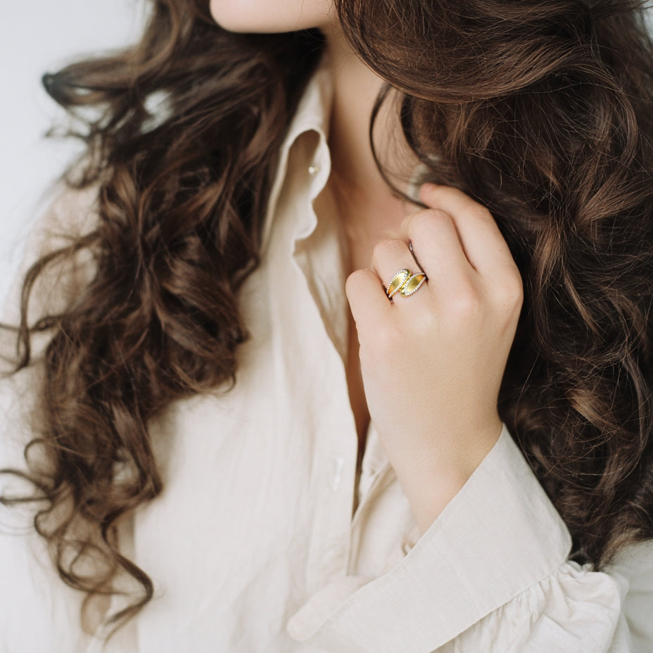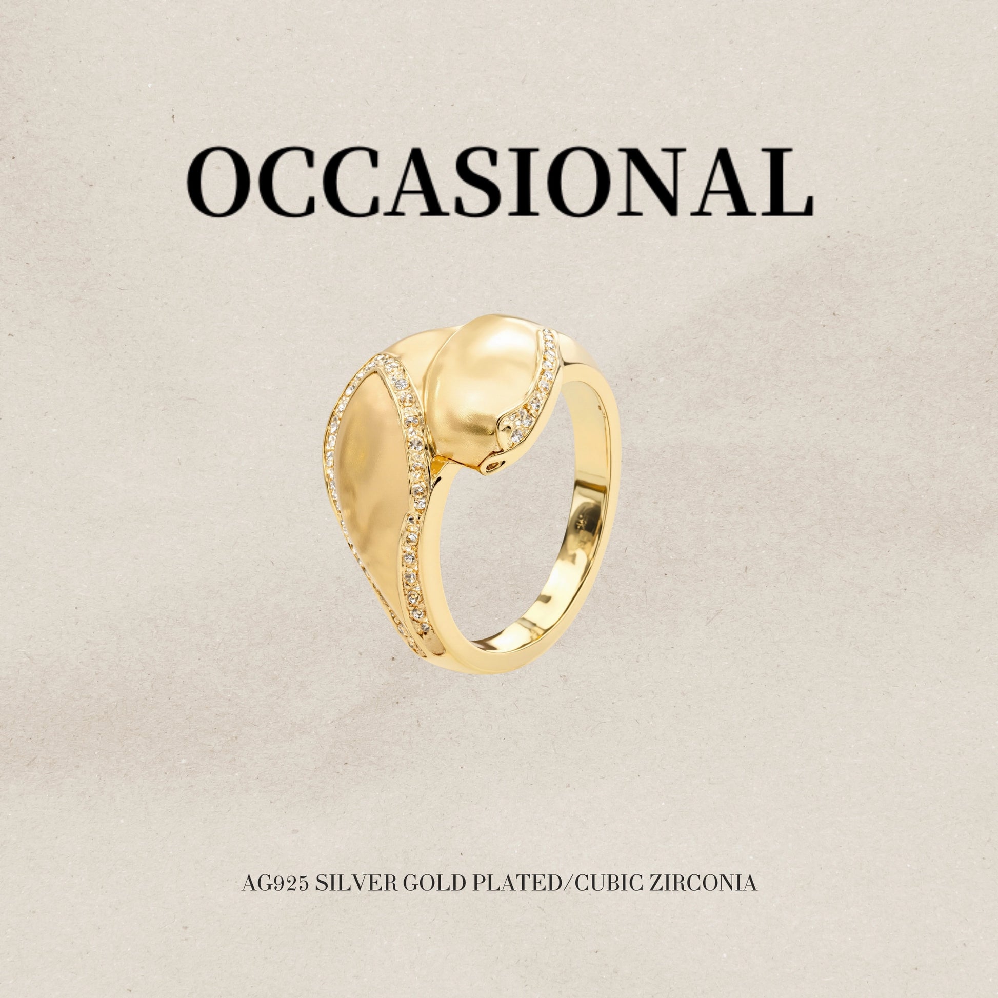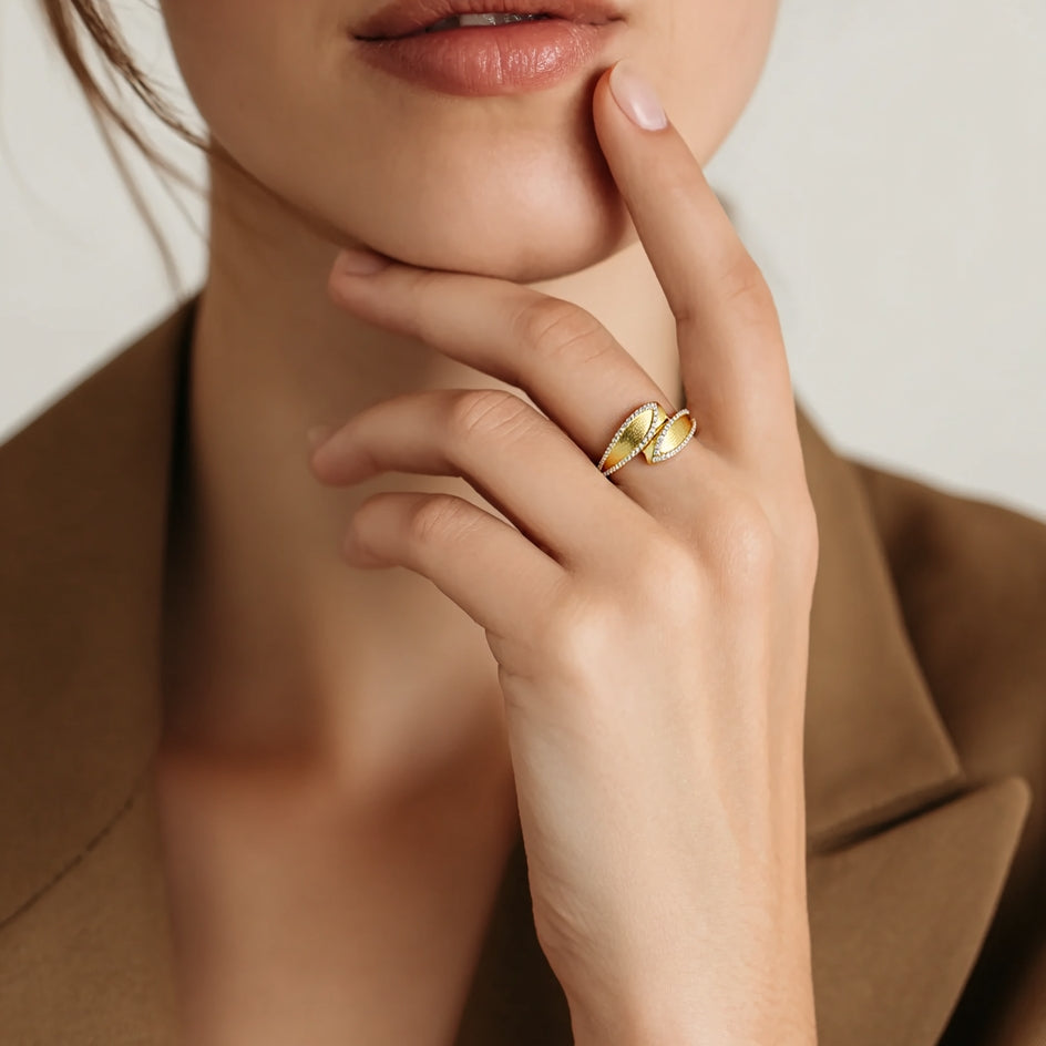 This trendsetting ring is inspired by the symbiotic relationship between spears and shields in the Neolithic Age. The ring is designed with an olive and teardrop shape embracing each other, symbolizing the "spear" and the "shield", and a circle of high-quality synthetic cubic zirconia is inlaid around the two. Wear it and feel an unprecedented sense of power.
