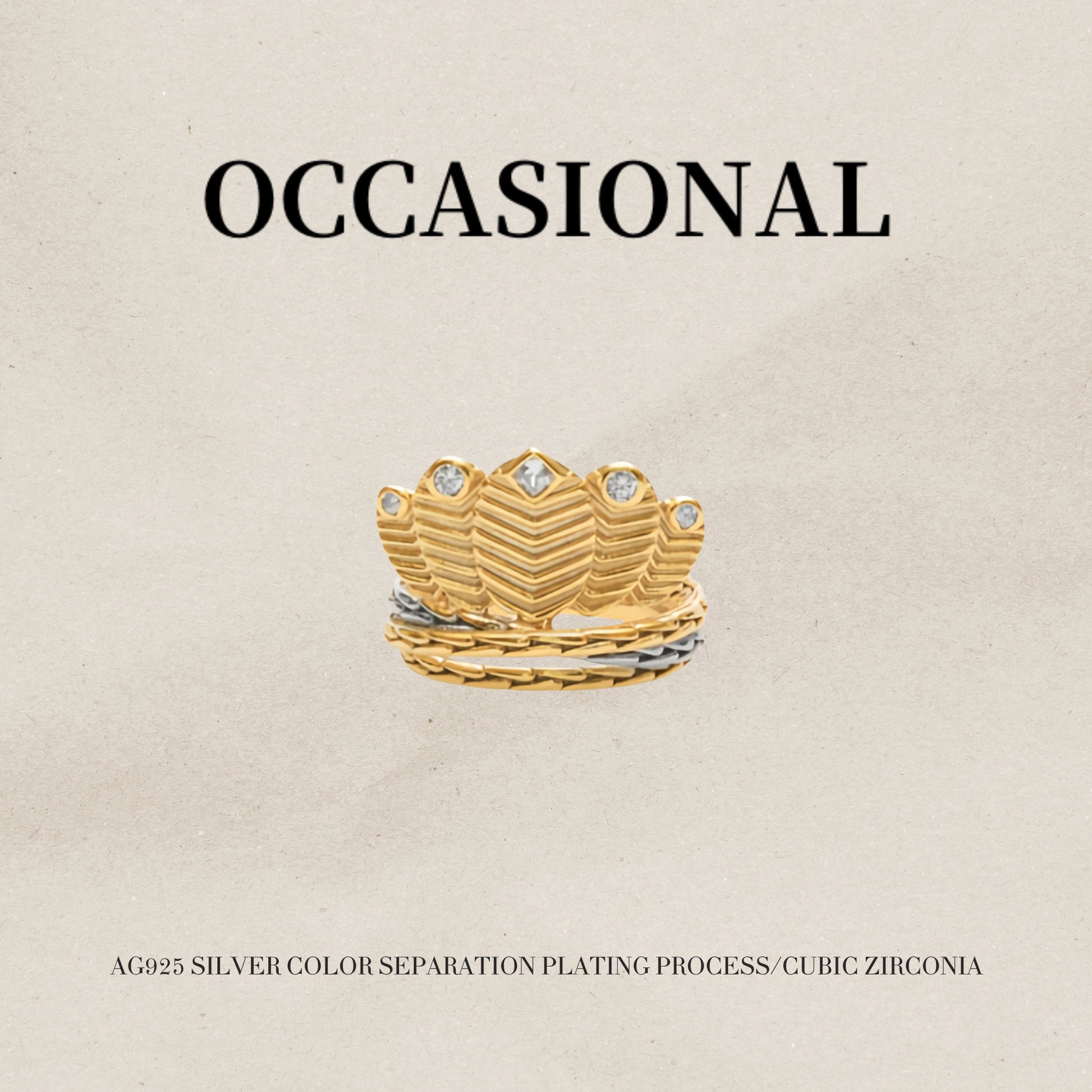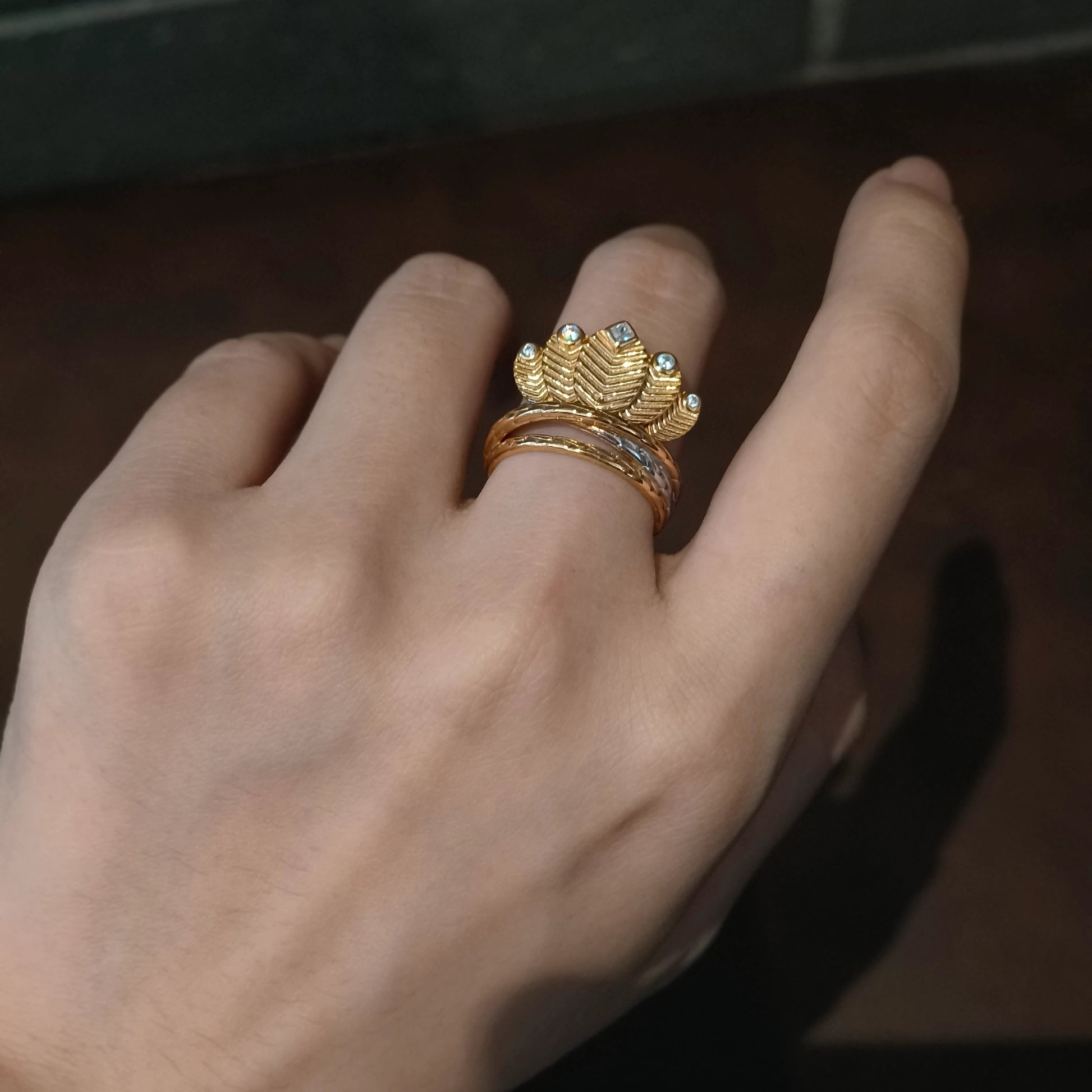 This gold and silver two-tone ring is decorated with 5 golden feathers on the ring band, inspired by the tribal chief's headdress, and is very powerful.