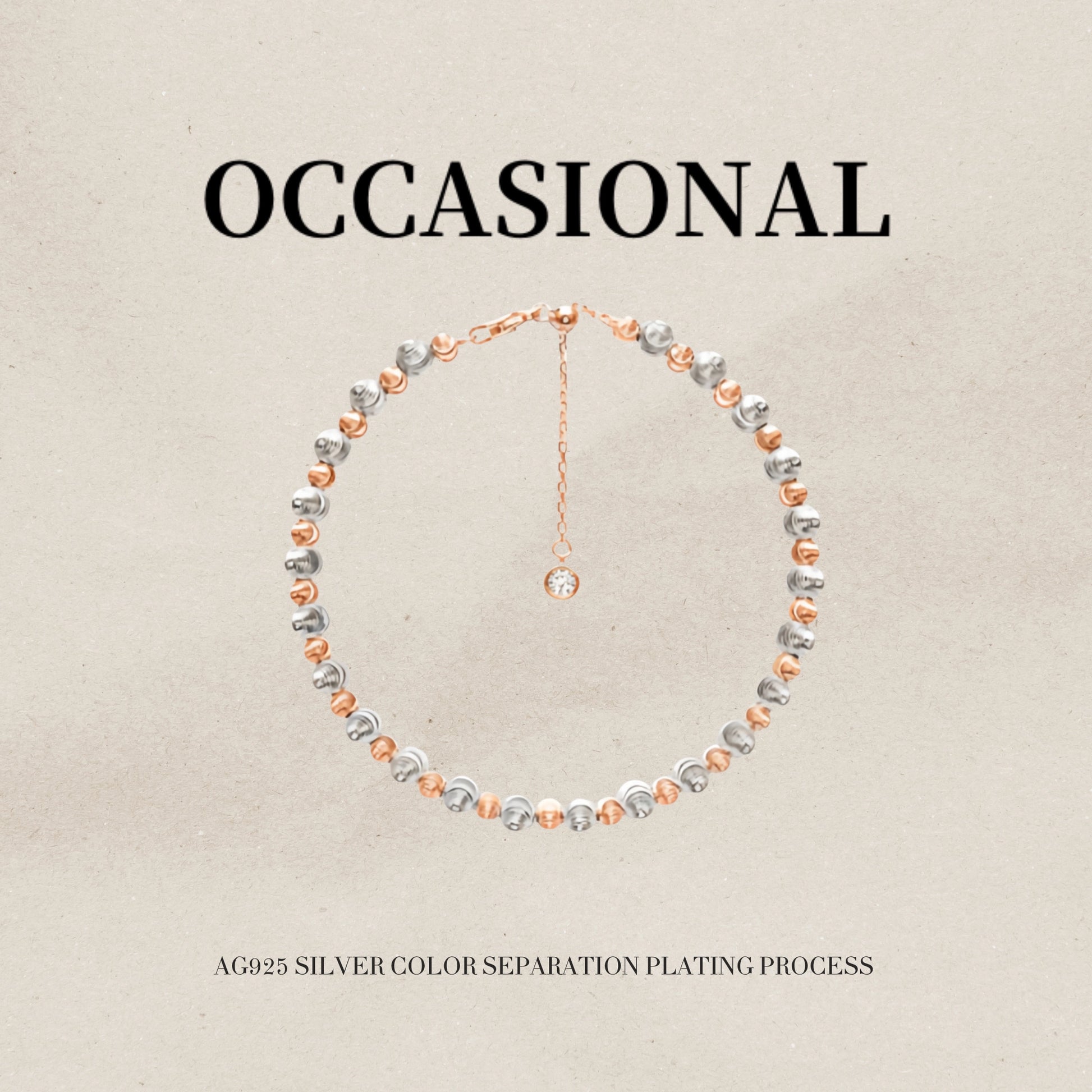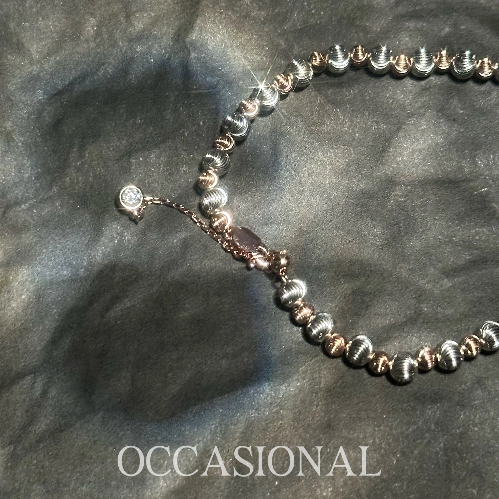 This daily two-color bracelet is composed of large silver balls and small rose gold balls. The surface of each ball is decorated with arc patterns, reflecting natural light 360°. You can see its brilliance when you wear it, and the lightweight bracelet design will make your hands look more slender. You can choose to wear it alone, or you can choose to wear it with a bracelet or watch. It is your best choice for daily travel and commuting accessories.
